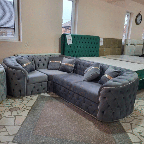 Acest colțar este conceput pentru a transforma livingul într-un spațiu confortabil și sofisticat. Tapițat în catifea de înaltă calitate, oferă o senzație plăcută la atingere și un aspect luxos. Pernele incluse, realizate din același material, sunt decorate cu detalii aurii, adăugând un plus de eleganță și rafinament întregului ansamblu.
