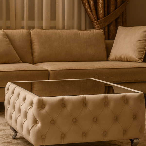 Baza este tapițată manual, cu un model capitonat sofisticat, care adaugă volum și un aspect luxos. Deasupra, masa este finisată cu o sticlă bronzată ce reflectă frumos lumina și completează perfect designul premium.