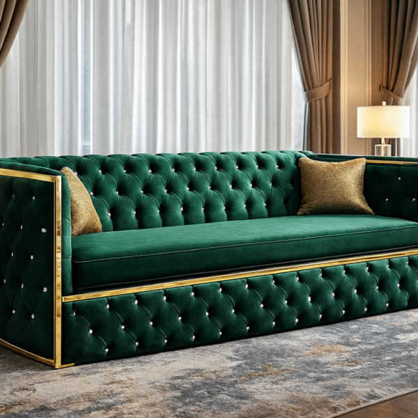 Canapeaua Smarald este o piesă de mobilier cu adevărat impresionantă, creată pentru interioare sofisticate și pentru cei care apreciază eleganța luxului clasic. Realizată din catifea fină, într-o nuanță profundă de verde smarald, canapeaua se remarcă prin tapițeria capitonată cu butoni decorativi și rama aurie ce conturează designul cu un plus de rafinament.
