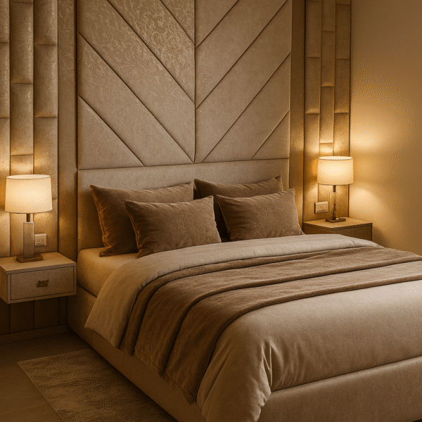 Textura catifelată a panourilor tapițate creează o atmosferă caldă și premium, în timp ce oglinzile adaugă lumină, lărgind optic încăperea și accentuând simetria întregului decor. Noptierele sunt gândite în același stil, pentru a completa armonios designul și pentru a oferi funcționalitate fără a compromite estetica.