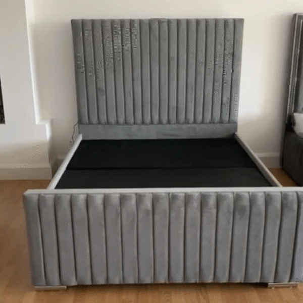 Baza patului este complet tapițată, cu linii curate și un design care se îmbină perfect cu tăblia, oferind atât stabilitate, cât și un aspect elegant.