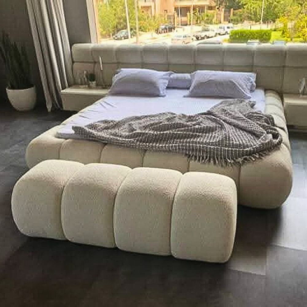 Baza extrem de pufoasă, tapițată în material texturat tip bouclé, creează