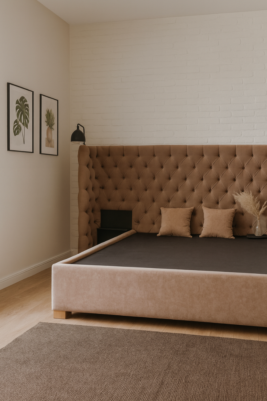 Dormitorul Mayson impresionează prin designul său modern și atipic, datorită tapițeriei supradimensionate, care se extinde elegant în exterior și transformă întregul ansamblu într-o piesă de accent spectaculoasă. Panourile tapițate creează un efect vizual unic, oferind personalitate și rafinament camerei, diferit de orice dormitor obișnuit.