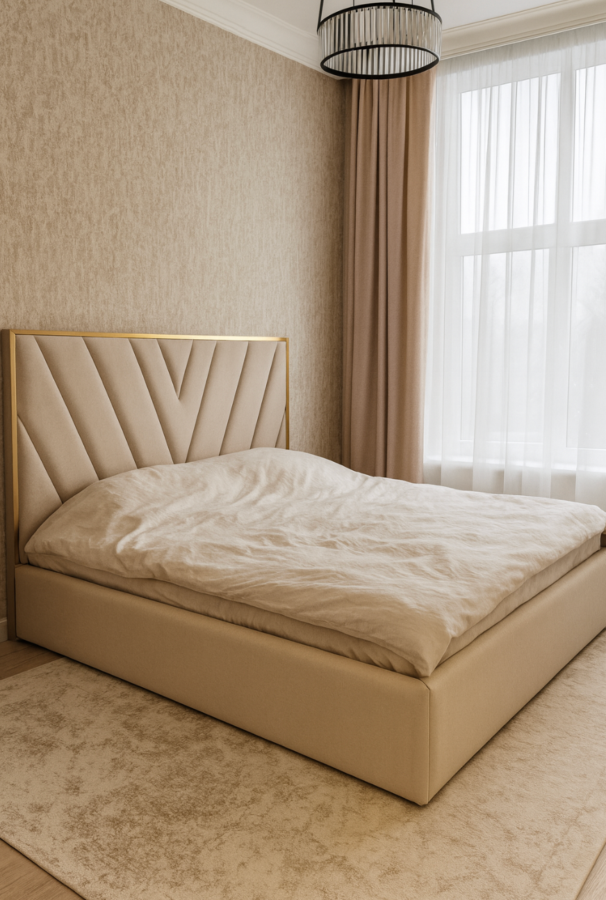 Patul Olivia este un model tapițat modern cu detalii aurii si o nuanta calda, creat pentru cei care apreciază liniile curate, detaliile atent lucrate și confortul de durată. Designul său minimalist, dar rafinat, îl face ușor de integrat în orice stil de dormitor – de la contemporan, la elegant sau chiar luxos.